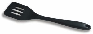 A espátula inteira em silicone tem formato ergonômico e gancho para pendurar.