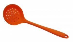 A escumadeira inteira em silicone tem formato ergonômico e gancho para pendurar.