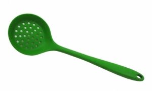 A escumadeira inteira em silicone tem formato ergonômico e gancho para pendurar.
